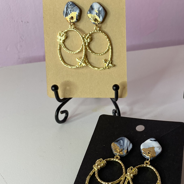 Black Marble And Gold Leaf Earrings With Gold Oval Accessories